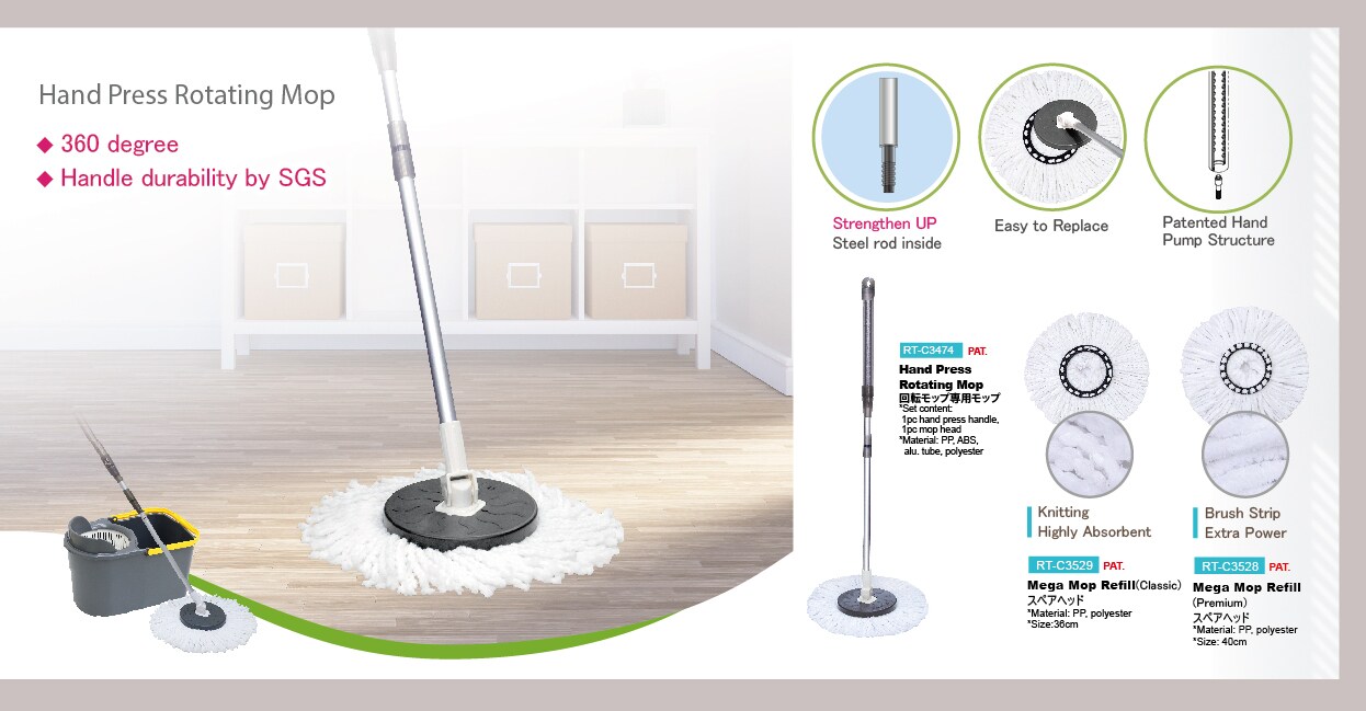 Engineered for fast, efficient cleaning, the RT-C3474 Hand Press Rotating Mop features a patented hand-press mechanism and 360° spinning function for effortless wringing. Its reinforced handle with inner steel rod ensures long-lasting performance, certified by SGS. Compatible with interchangeable mop refills, this system is ideal for both home and commercial use. Available with highly absorbent knitted or extra-power brush-strip refills.
